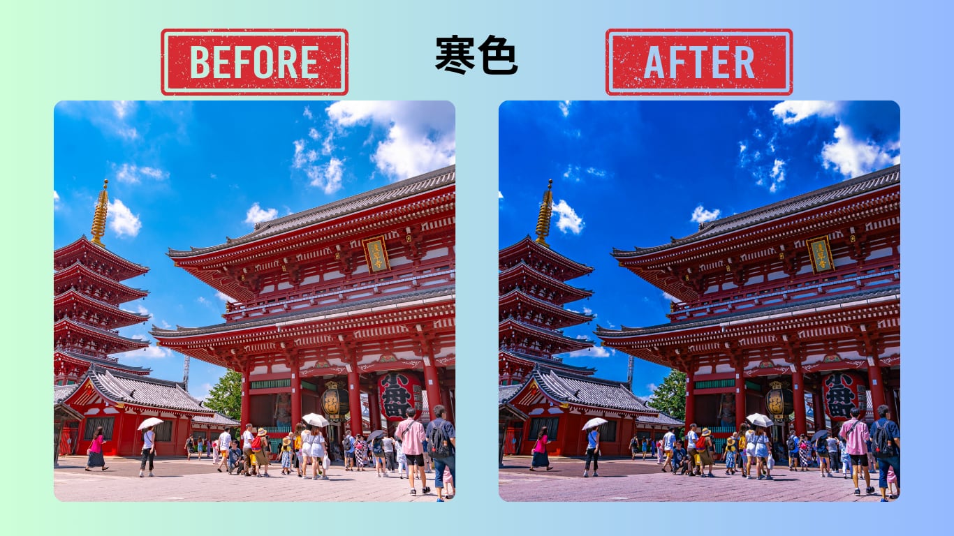 全体の色味調整については、「白黒、寒色、暖色、暗い、明るい」の中から